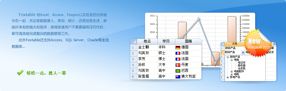 Foxtable將Excel、Access和Foxpro的優(yōu)勢融合在一起,并獨有層級數據管理功能,普通用戶不需要編寫任何代碼,即可完成各種復雜的數據管理工作,真正做到拿來即用。